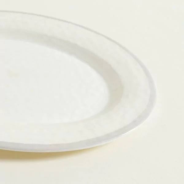Bandeja oval de melamina color beige con borde gris, y blanco brillante por fuera.